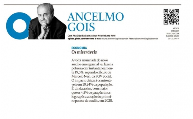 Veja a matéria completa em: https://www.cps.fgv.br/cps/bd/clippings/yc0289.pdfMeio: O Globo - RJMídia: Jornais e RevistasData: 10/04/2021Jornalista: Ancelmo Gois