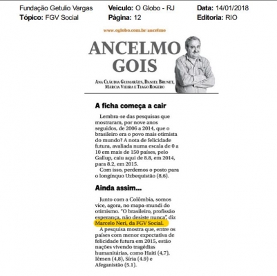 Veja a matéria completa em: https://www.cps.fgv.br/cps/bd/clippings/uc001.pdfMeio: O GloboMídia: Jornais e RevistasData: 14/01/2018Jornalista: Ancelmo Gois