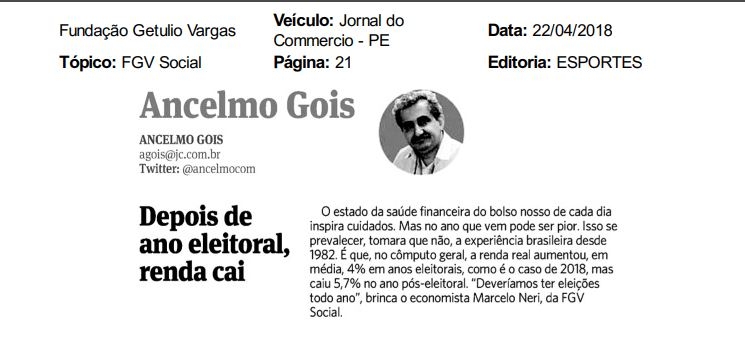 Veja a matéria completa em: https://www.cps.fgv.br/cps/bd/clippings/uc095.pdfMeio: Jornal do Commercio - PEMídia: Jornais e RevistasData: 22/04/2018Jornalista: Ancelmo Gois