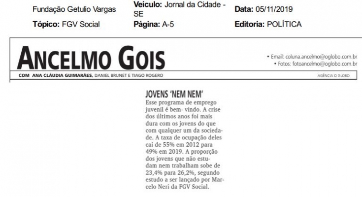 Veja a matéria completa em: https://www.cps.fgv.br/cps/bd/clippings/vc715.pdfMeio: Jornal da Cidade - SEMídia: Jornais e RevistasData: 05/11/2019Jornalista: Ancelmo Gois